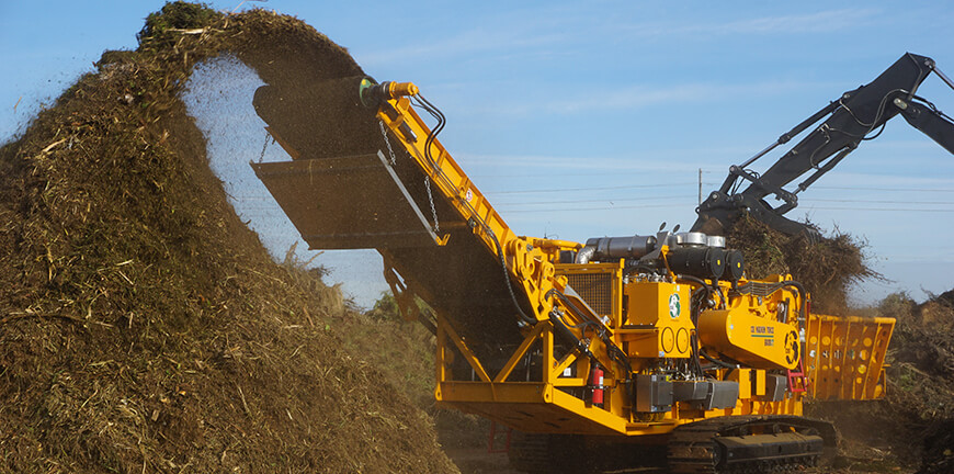 O triturador 484VT é equipado com um motor de 765 hp para máxima produtividade. A configuração com esteiras permite fácil manobrabilidade no local e eficiência ideal no carregamento. O tubo de descarga giratório com rotação de 290° reduz ao mínimo a necessidade de reposicionar o caminhão durante o carregamento. Os tubos de descarga estão disponíveis nas configurações reta, flexível ou vertical. Há duas opções de rotor disponíveis para produzir cavacos de combustível e microchips.